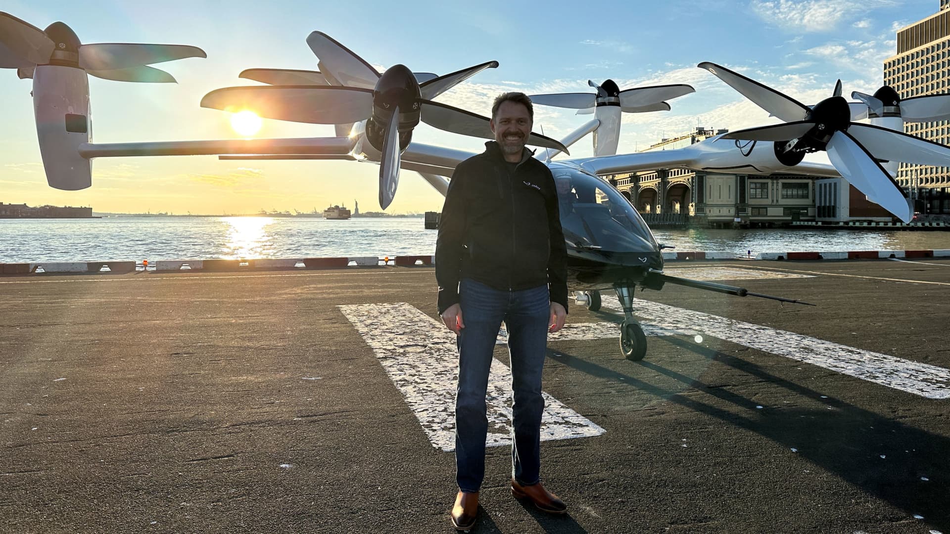 JoeBen Bevirt, founder and CEO of Joby Aviation, stands near an electric air taxi by Joby Aviation at the Downtown Manhattan Heliport in Manhattan, New York City, U.S., November 12, 2023.